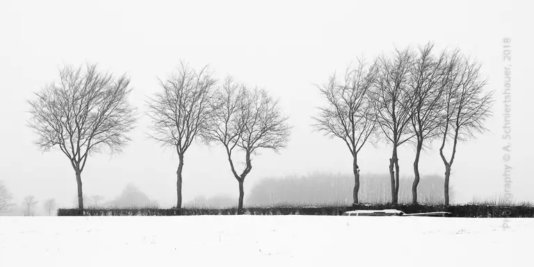 In the 12th exhibition I show four digital photographs in black and white showing snowy misty winter landscapes shot in the Eifel in 2018.